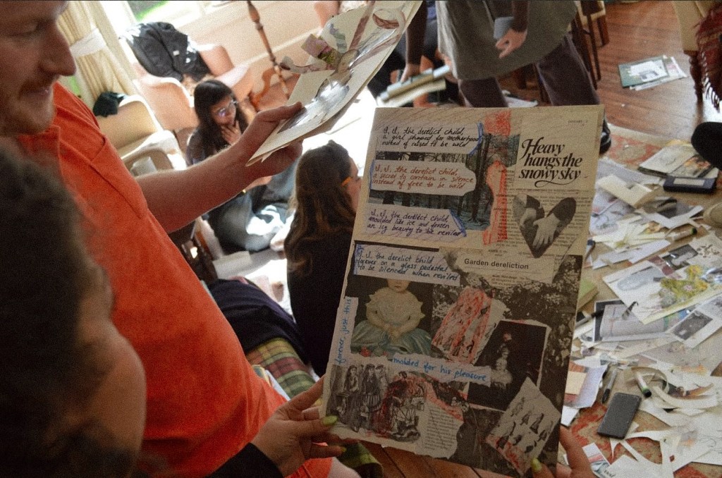 These conversations worked in tandem with the retreat workshop planned by Seedlings Magazine which focused on childhood, play, and sanctuary. We began by collaging in the morning, ripping pages out of books, tearing photos into the shapes we wished, and sitting in a state of play, in a state of mess, in line with our inner child. While putting my piece together, I realized how much whimsy my inner child was missing. I found some images that pulled at my heart and created a piece I’ve now entitled ‘The Derelict Child.’